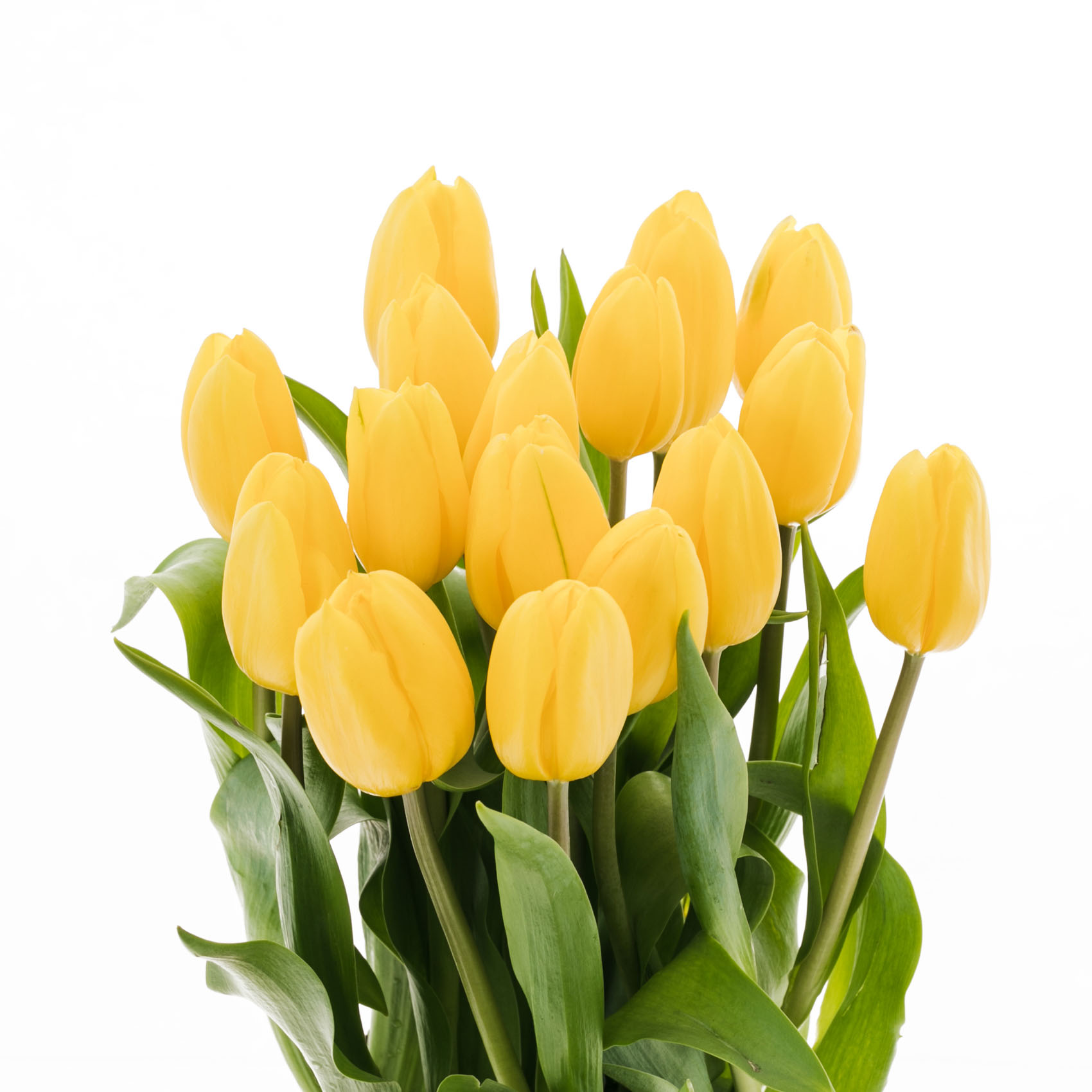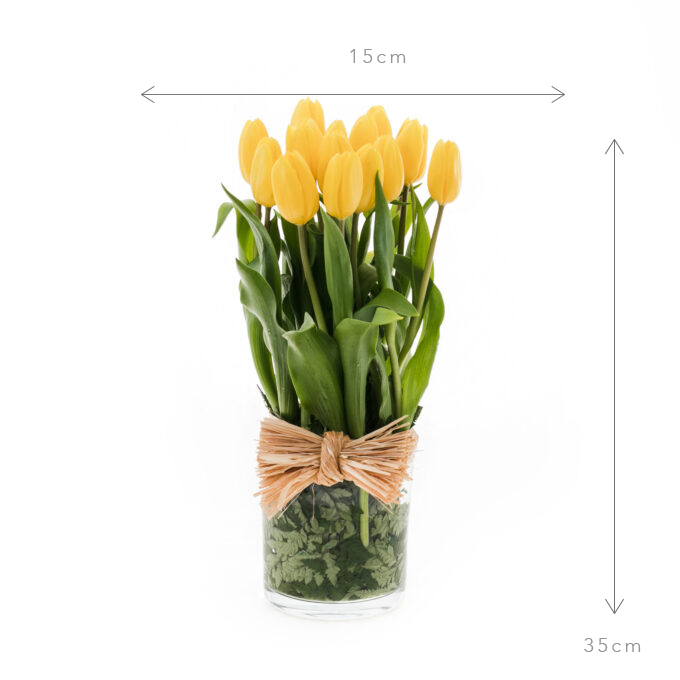 Centro de tulipanes en base de cristal baja.