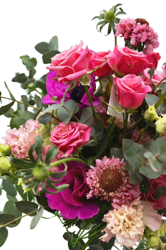 Composición de flores naturales en base de cristal. Este diseño equilibra texturas seleccionadas en una gama cromática de tonos fresa y rosa pastel. La pieza se completa con verdes de temporada que aportan un contraste natural.