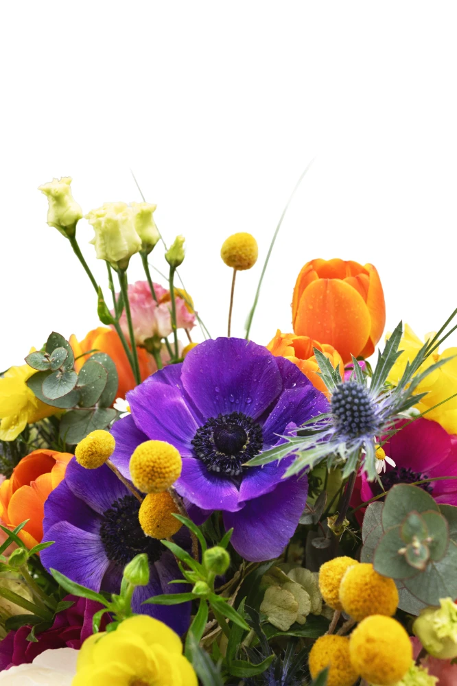 Composición de estilo silvestre en base de cristal. Esta pieza integra una selección de flores frescas en una armonía cromática multicolor. El diseño destaca por su riqueza de texturas y acentos botánicos que aportan un carácter orgánico y sofisticado.